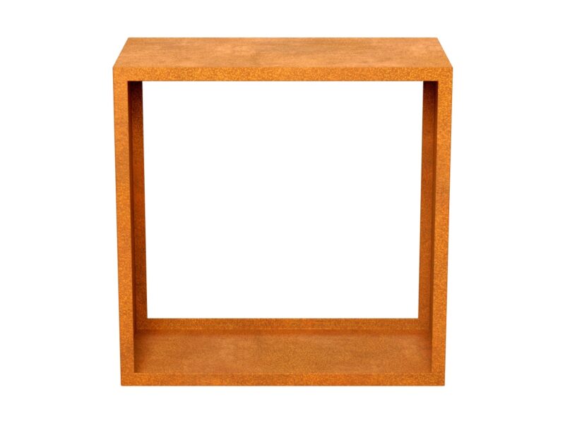 Seine kubische, symmetrische Form verleiht ihm eine moderne Anmutung, während die charakteristische Rostpatina des Cortenstahls Wärme und Natürlichkeit ausstrahlt.